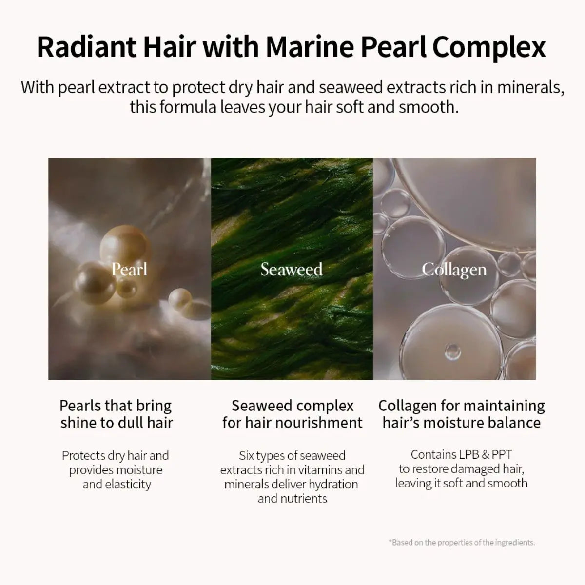 Aqua (Water), Glycerin, Butylene Glycol, Hydrolyzed Collagen, Soluble Collagen, Ferment Complex, Algae Extract, Ceramide NP, Panthenol, Arginine, Polyquaternium-10, Dimethicone, Amodimethicone, Trideceth-12, Cetrimonium Chloride, Citric Acid, Parfum (Fragrance), Benzyl Alcohol, Potassium Sorbate, Sodium Benzoate